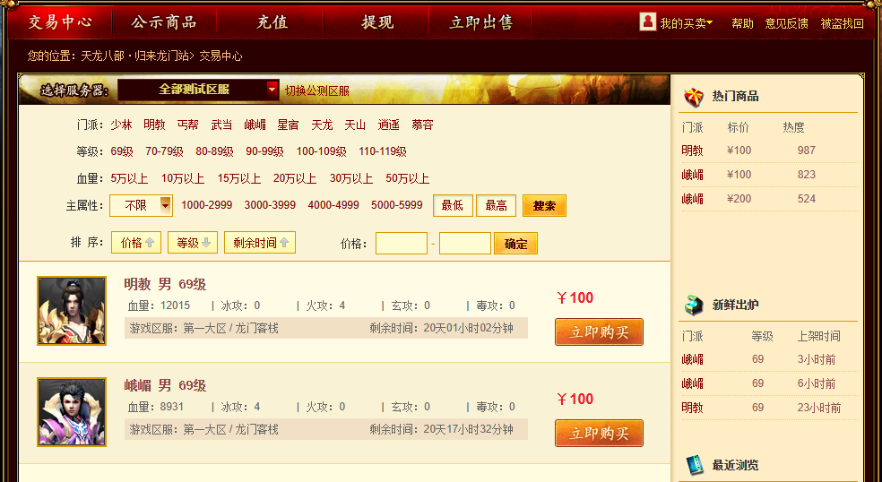 上方筛选列表提供服务器、门派、等级等高级筛选功能,可以帮助您快速的找到您需要的商品。您也可以在搜索框中直接搜索您想要找的角色名称,精确查找。