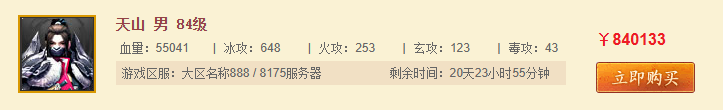 商品详情页与游戏数据直接连通,全面展示游戏角色的数据信息。点击购买按钮即可下单。