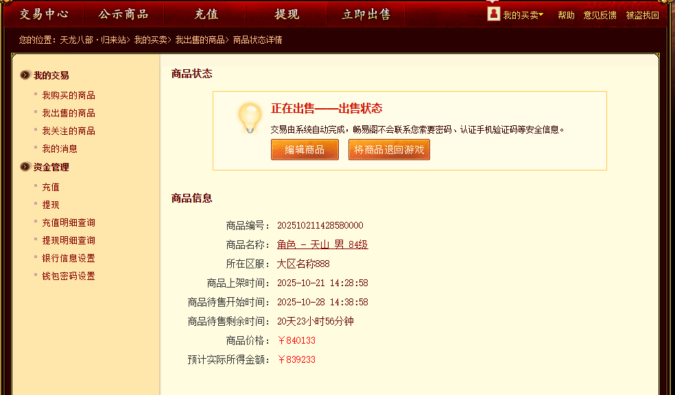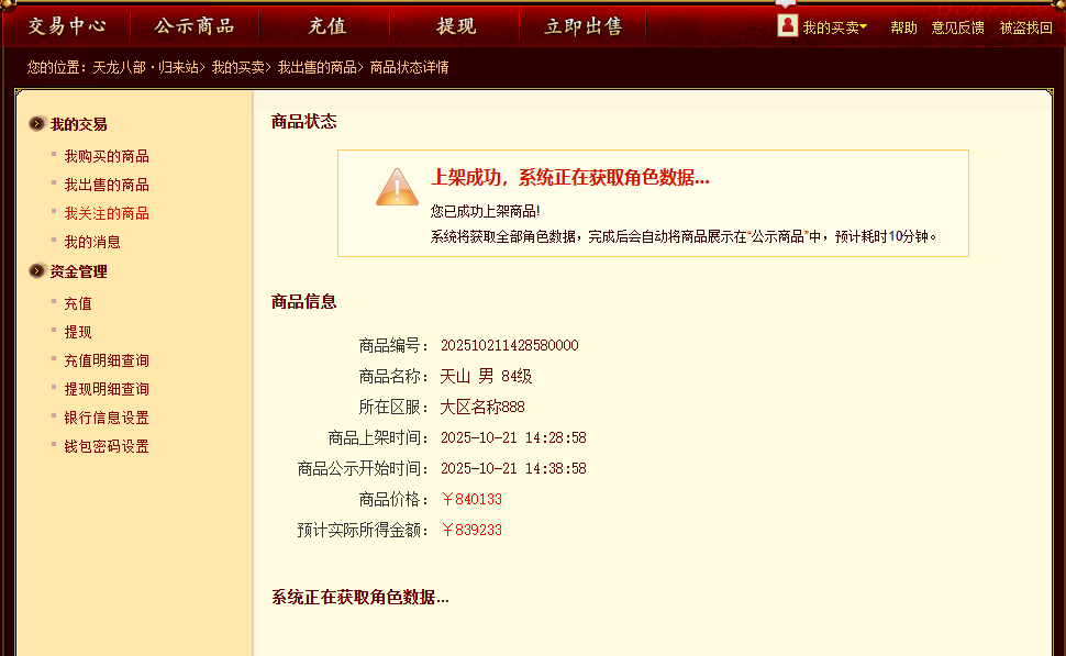 C.完成寄售后,有10分钟更新数据时间,角色信息上架完成,在我的买卖-我出售的商品处可进行商品定价修改或退回操作。